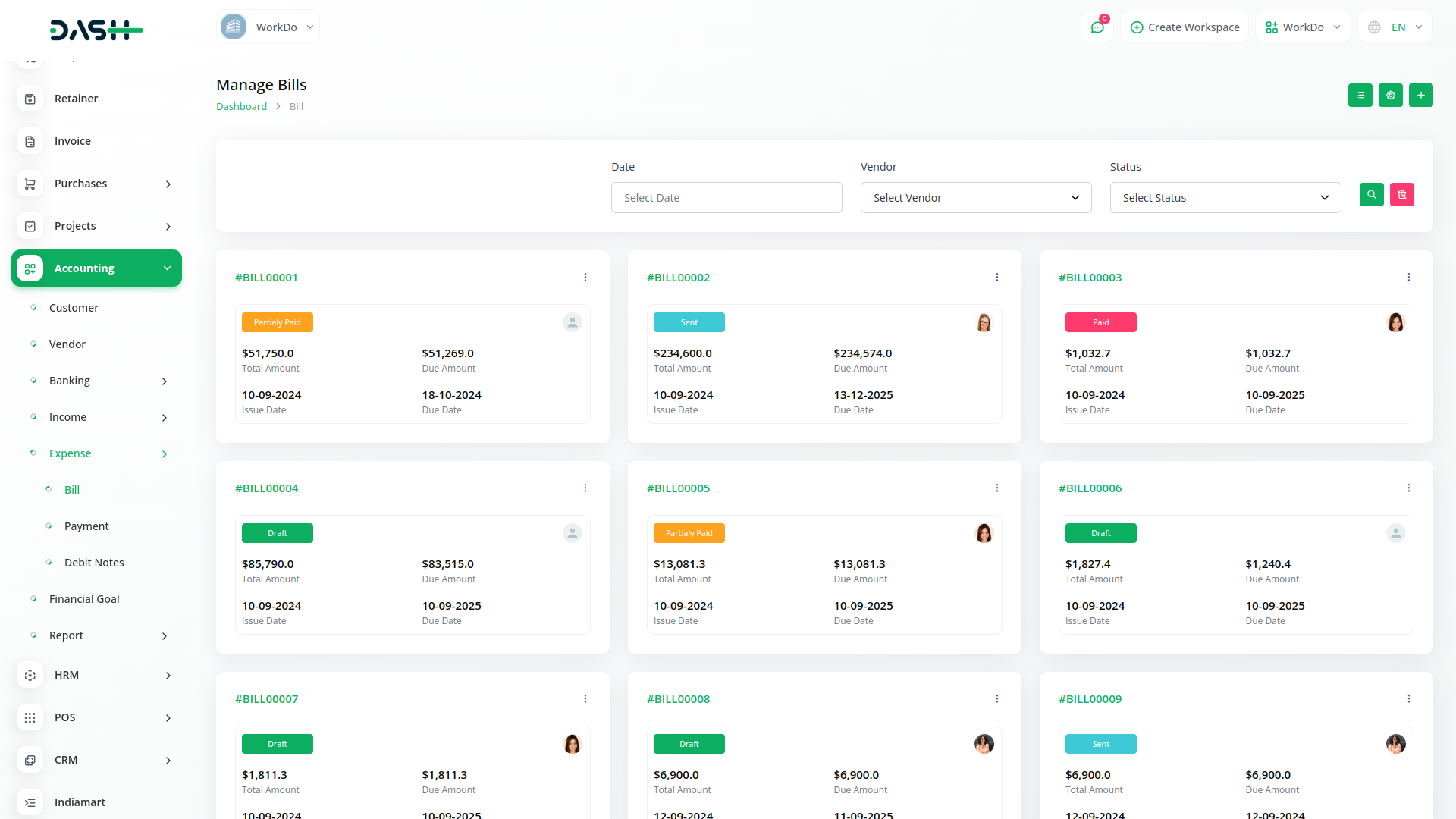 Account es un software de administración de cuentas que facilita el cálculo de ingresos al mantener un registro de todos los asuntos contables de los negocios. Basado en Laravel, este software de contabilidad hará que sus operaciones comerciales sean fluidas y convenientes. Una representación gráfica y tabular de varios elementos le ayudará a tomar decisiones informadas para su empresa.