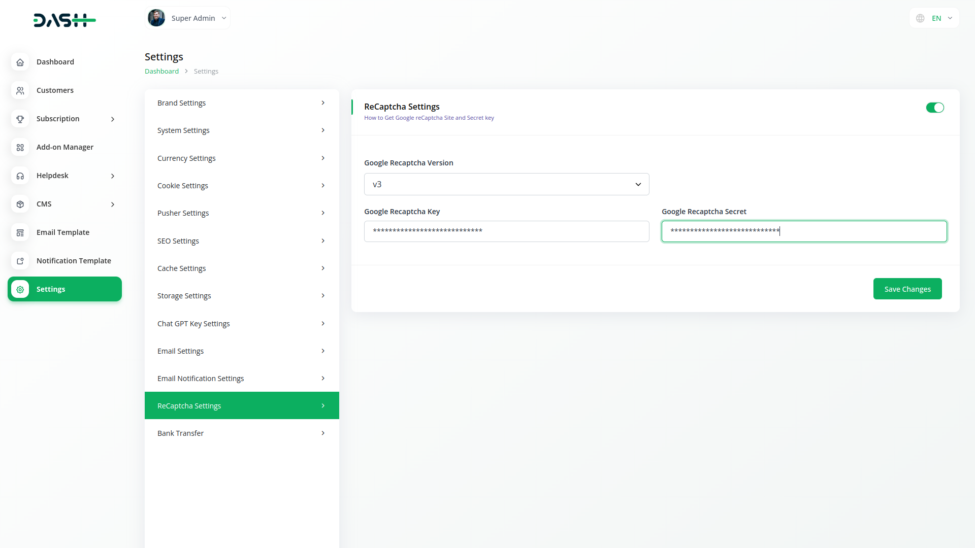 El par de claves consta de una clave de sitio y una clave secreta. La clave del sitio se utiliza para invocar el servicio reCAPTCHA en su sitio o aplicación móvil.