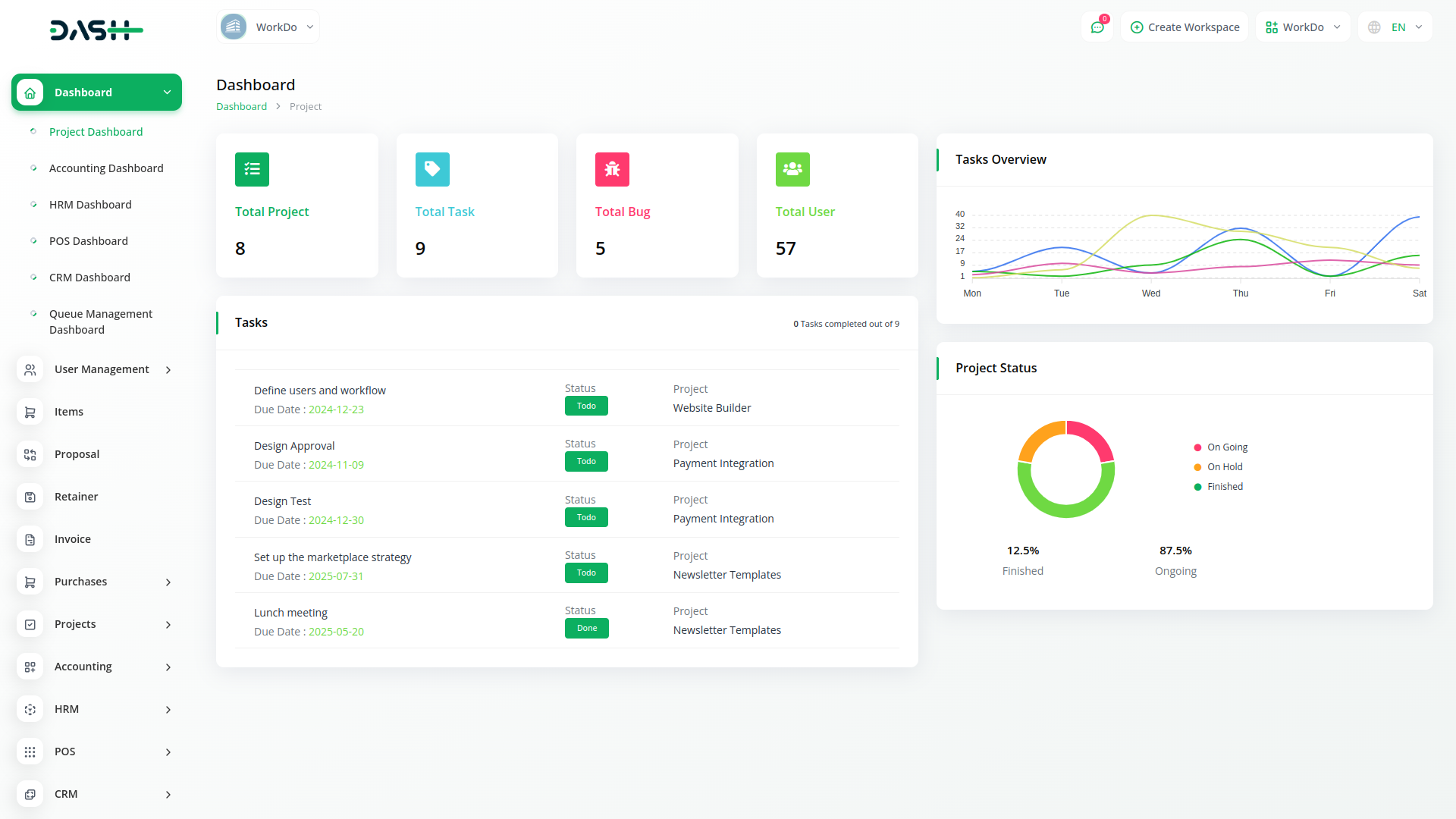 Obtenga una descripción general del número total de proyectos, tareas, errores y miembros. Una representación visual de la descripción general de la tarea y el estado del proyecto puede ayudarlo a estimar el progreso de cada tarea. Por último, puede consultar la tarea principal pendiente.